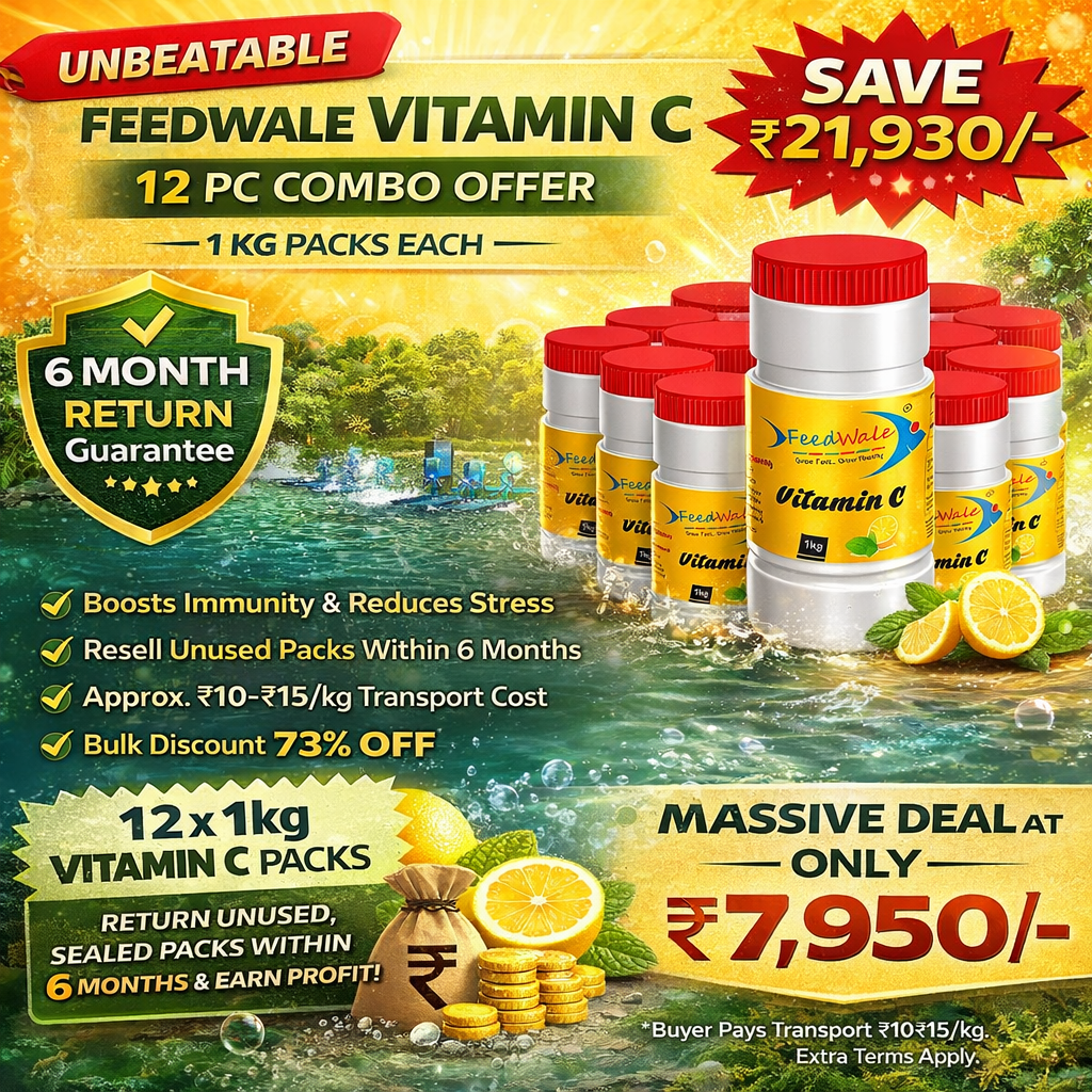 FeedWale Vitamin C is a premium fish feed supplement formulated to improve immunity, stress resistance, survival rate, and overall fish health.